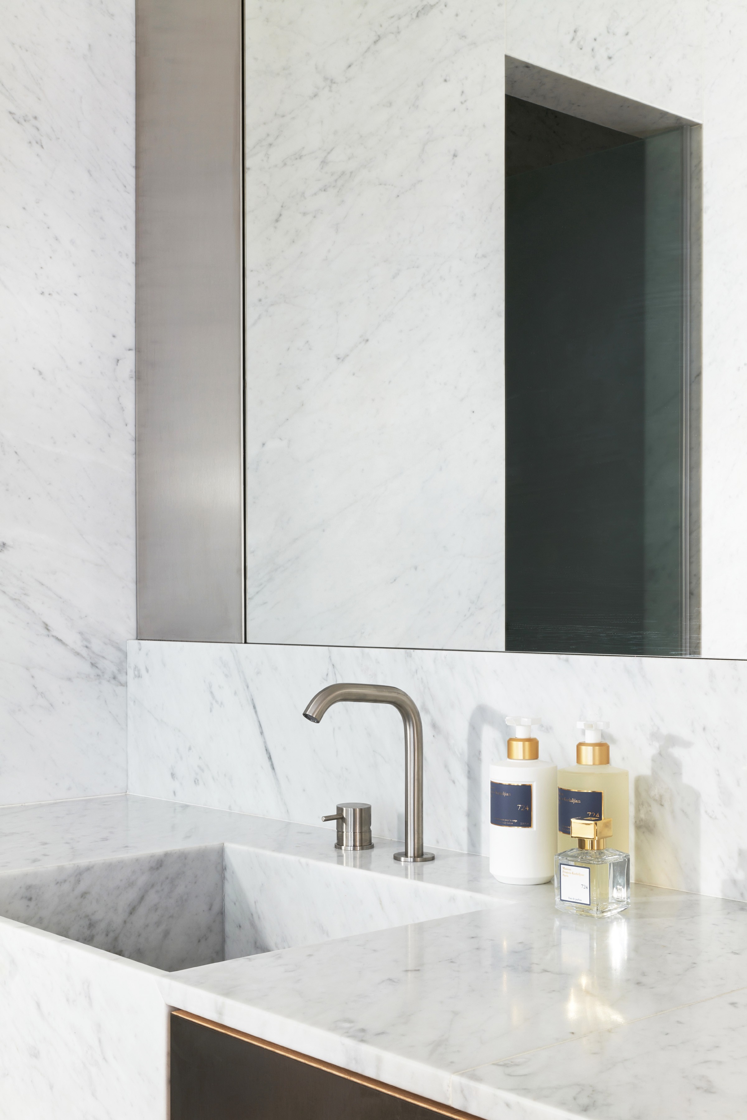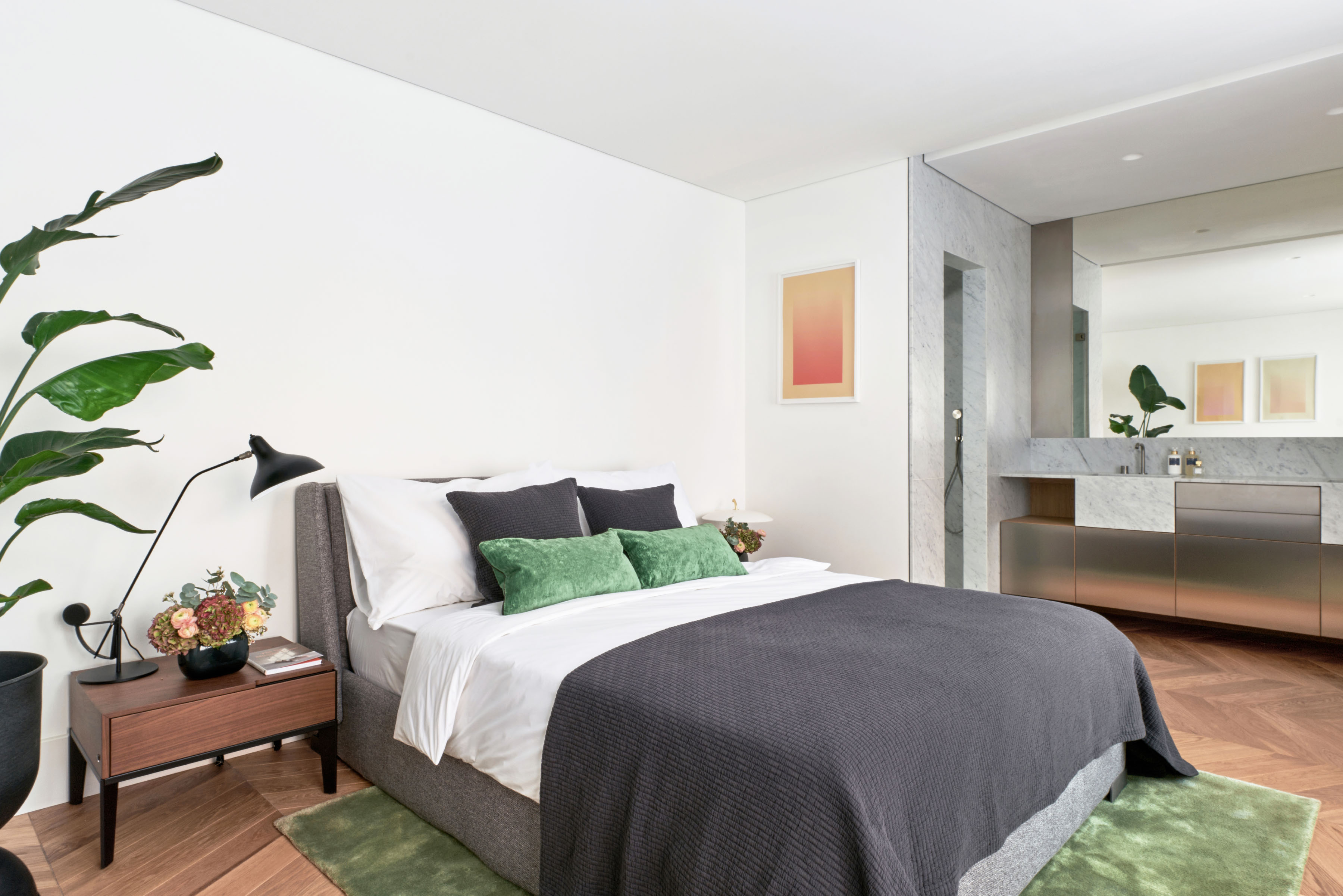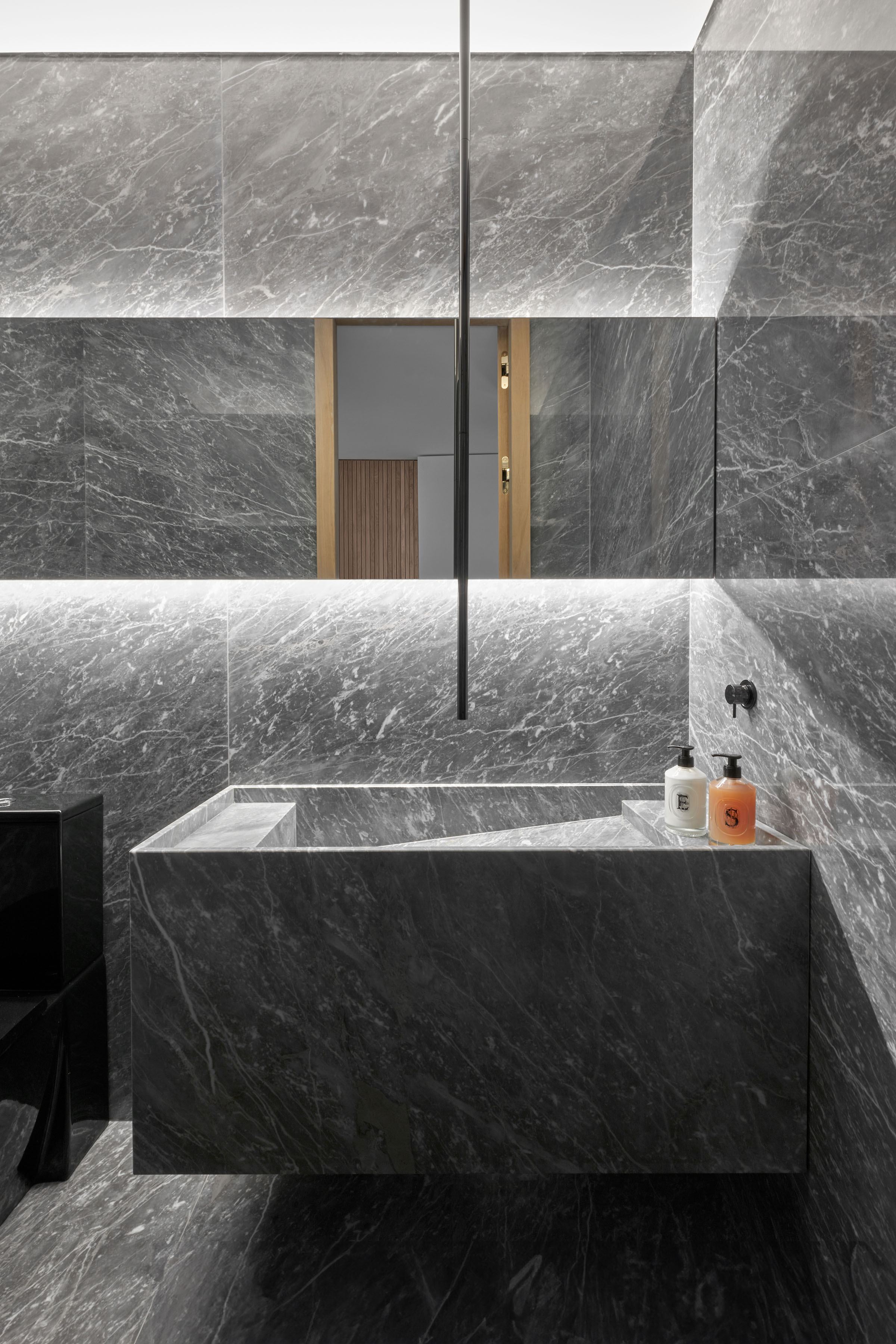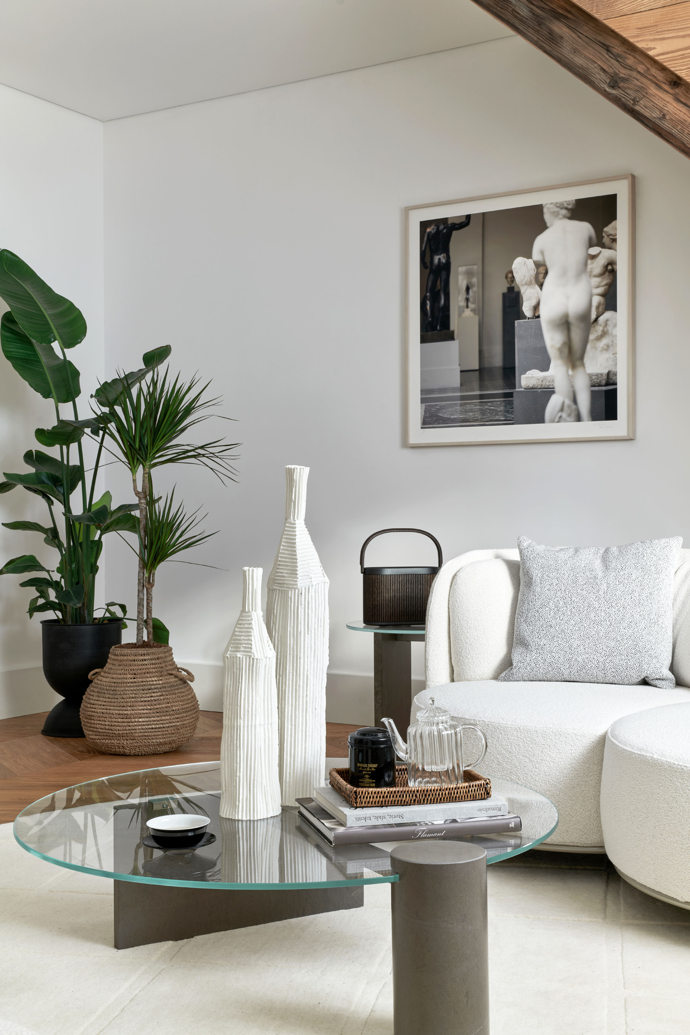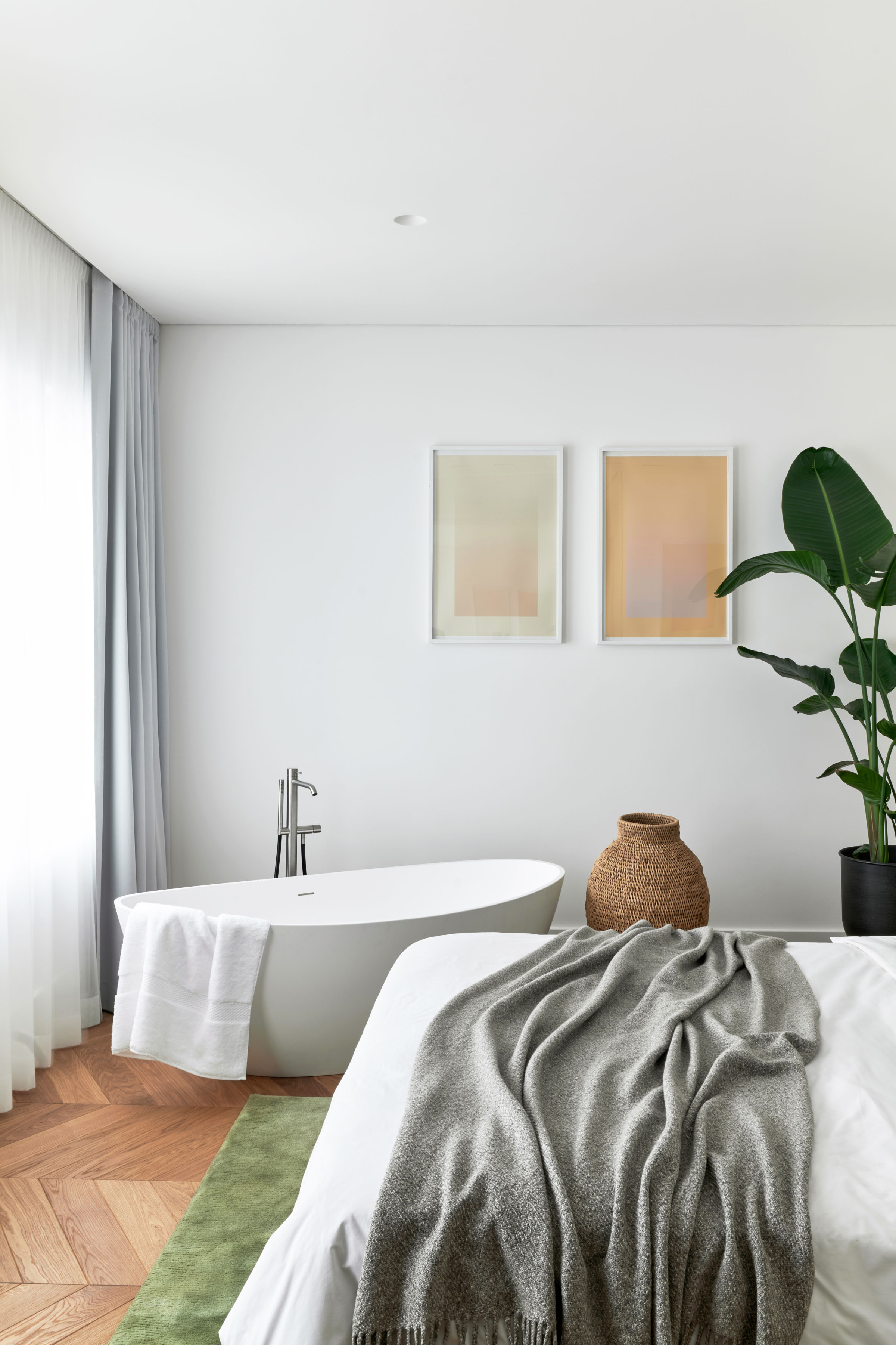 The intention of the complete renovation of the apartment was to restore the artistic values in the historic apartment unit, while sensitively incorporating modern elements and technologies into the space (use of frameless sliding doors to the outdoor atrium, use of smooth polyurethane floor and wall wipers, etc.). Wood textures in natural tones were preferred for the finishing. Natural stone in light shades was used in the bathrooms and toilet. All the washbasins in the apartment are also stone. The furniture and artworks were selected together with the stylist - a large part of them were found and selected in Prague, some of them are from the architect's private collection. Highlights include various sofas, arranged to bring balance to the environment.