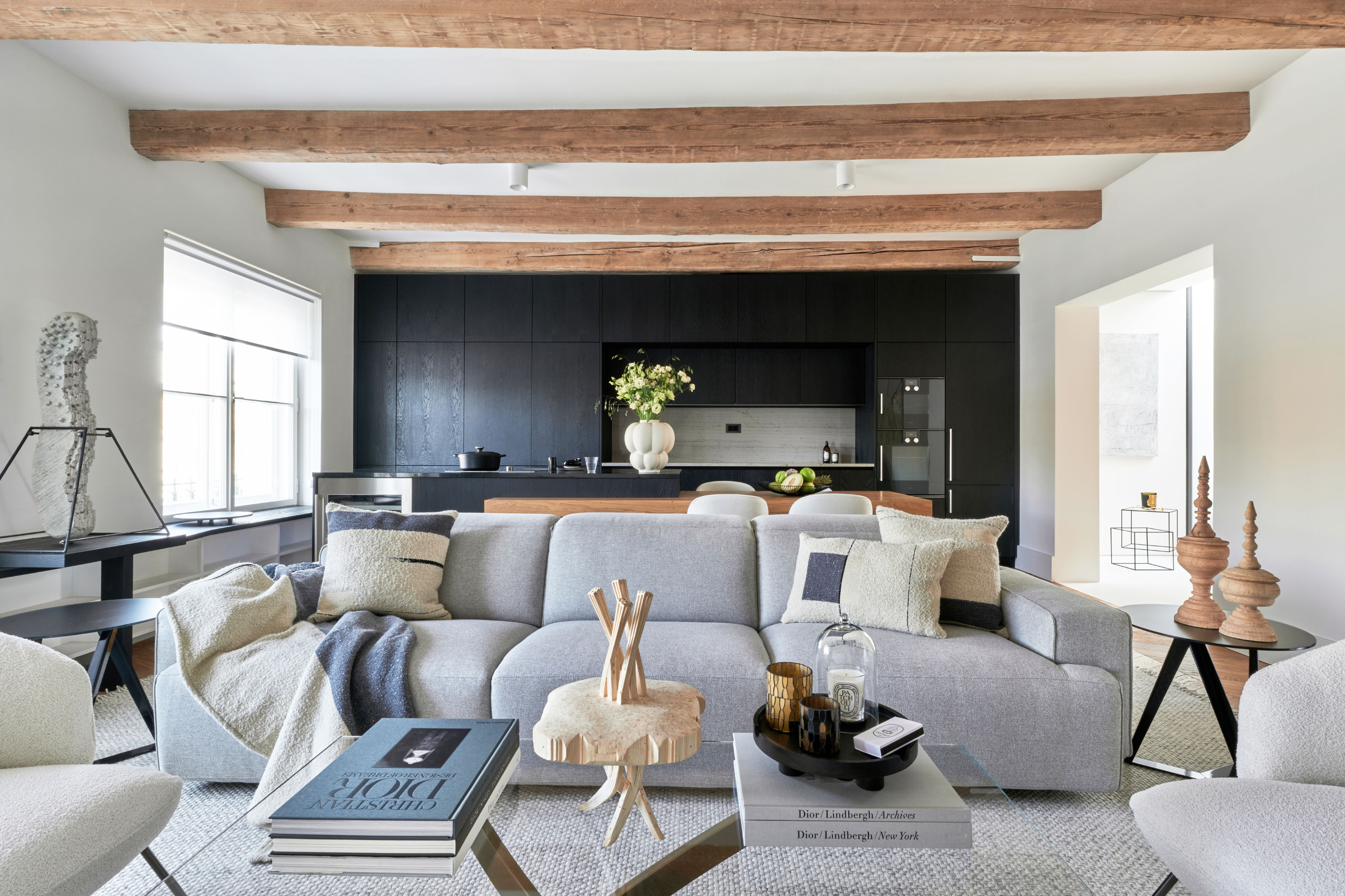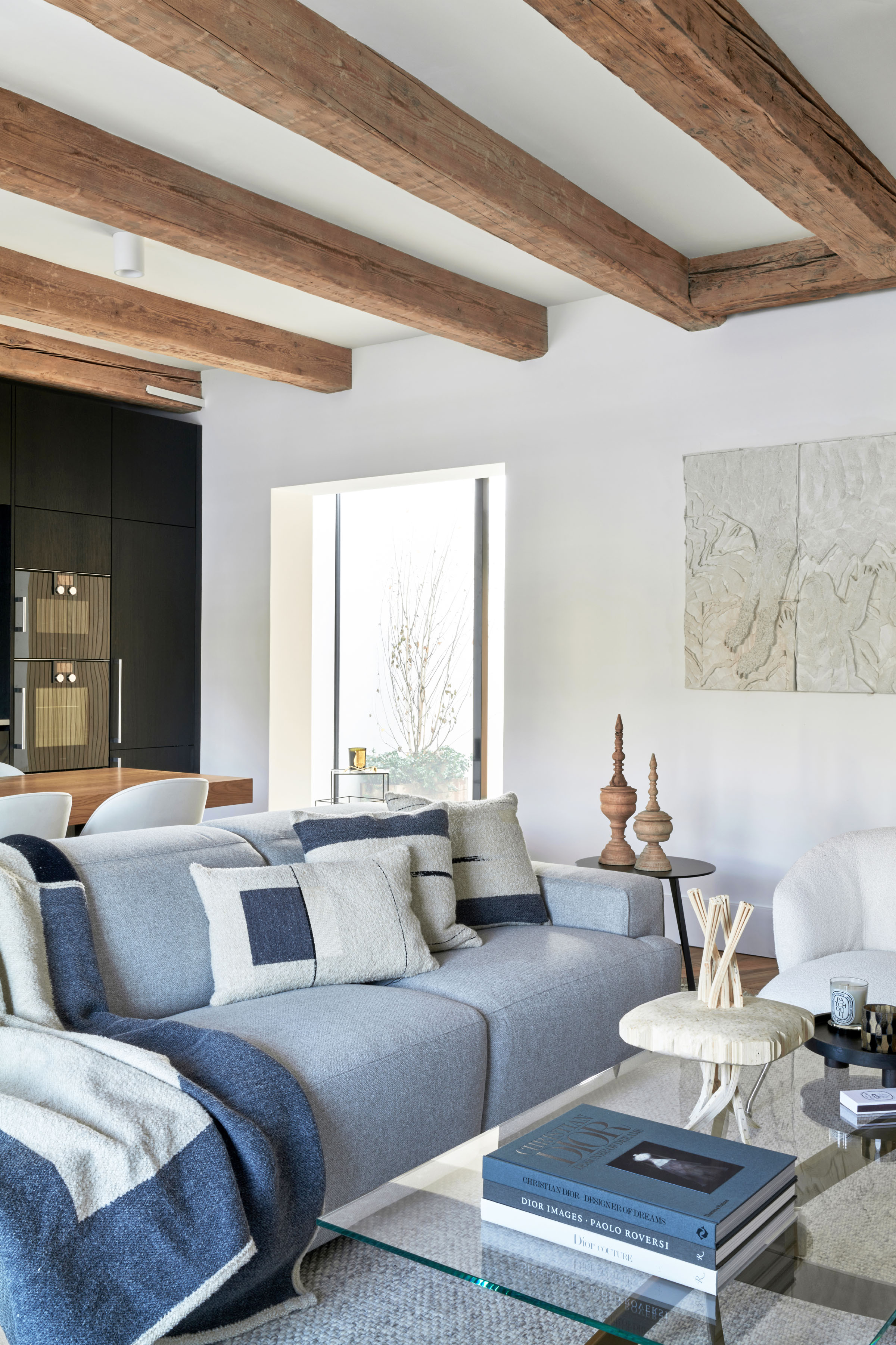 The wooden beamed ceilings in the living room, which were covered by the original reed ceiling, were stripped and cleaned to create the historic character of the original apartment space.
